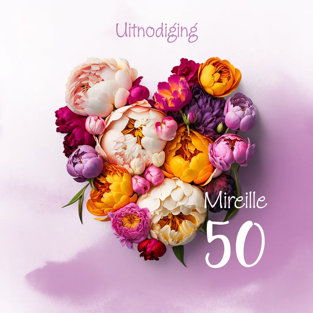 Prachtige uitnodiging voor 50e verjaardag. Met een groot kleurig hart van bloemen. De paars roze waterverf in de achtergrond en het jaartal zijn te veranderen. Binnen nog ruimte voor eigen foto.