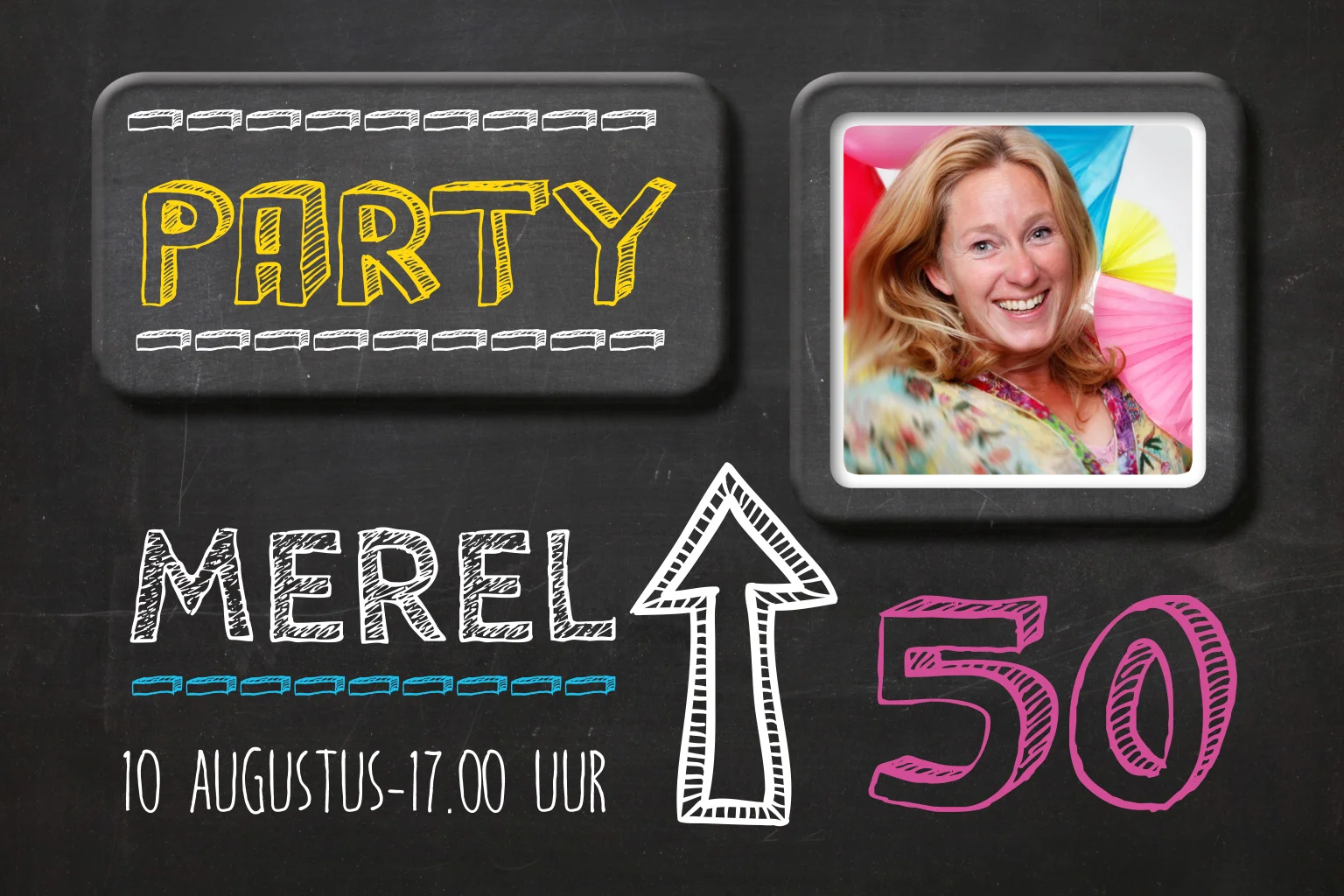 Krijtbord uitnodiging die je helemaal naar je eigen wens kunt maken. Pas de kleuren van de teksten aan je foto aan en het wordt een persoonlijke kaart