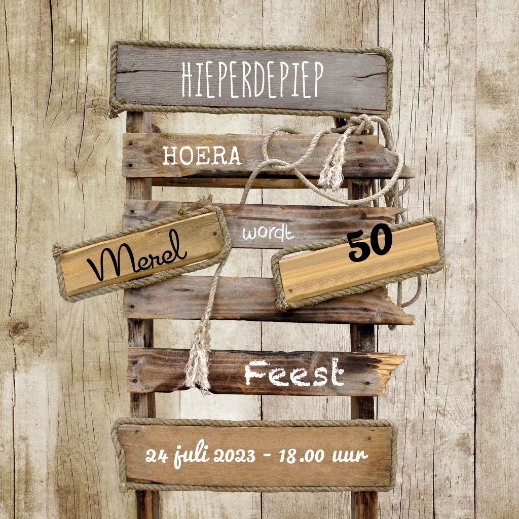 Stoere uitnodiging voor je 50e verjaardag. Op de houten planken kan je de teksten aanpassen.