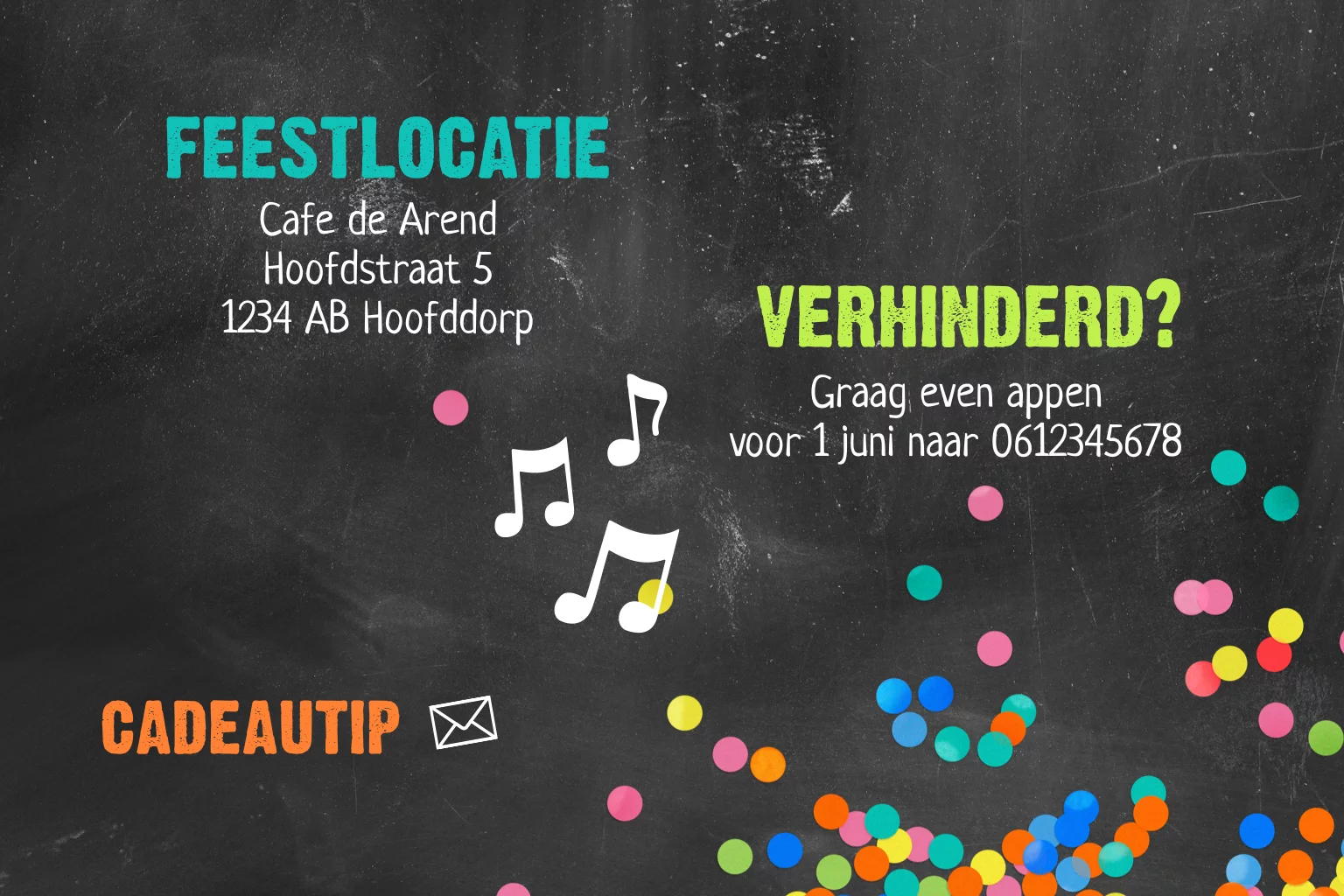 Proost op jou! Deze vrolijke confetti en krijtbord uitnodiging is al een feestje op zich om te versturen. Nodig al je vrienden uit voor je 50e Abraham verjaardag. Maak het helemaal af met een bijpassende kleur envelop.