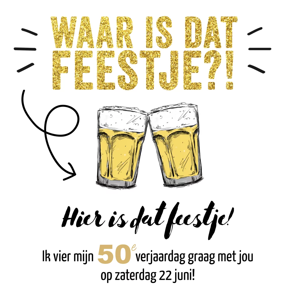 Waar is dat feestje?! Nodig je vrienden en familie feestelijk uit met deze vrolijke uitnodiging. De gouden glitter en toevoeging van biertjes maken de kaart helemaal af. Gaaf met een gouden envelop!