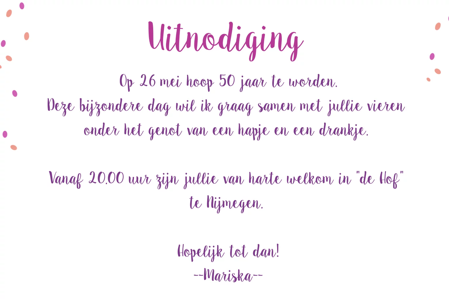 Uitnodigingskaart vijftig jaar met paarse confetti