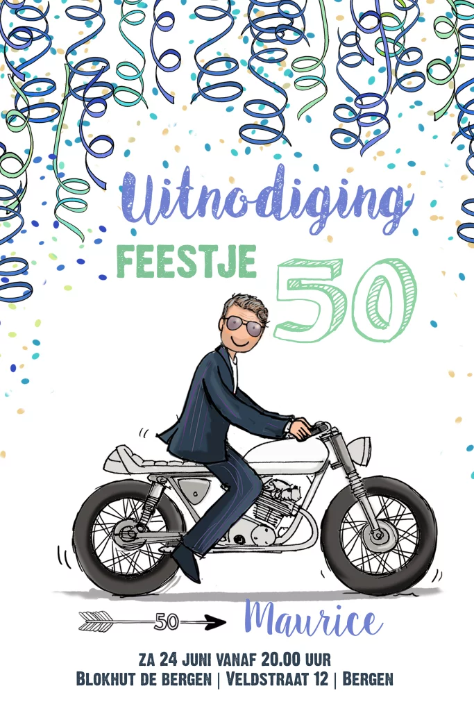 Feestelijk 50 uitnodigingskaart voor een Abraham! De kaart is geïllustreerd met een motor, slingers en feestelijke blauwe en groene confetti. Teksten zijn aanpasbaar. Combineer de uitnodiging met een donker blauwe envelop!