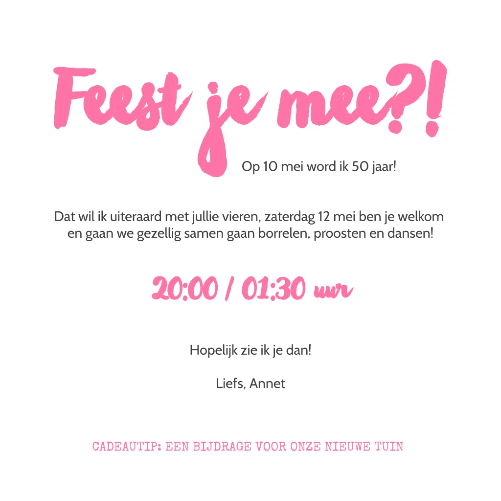 Tijd voor een feestje! Nodig je vrienden familie uit voor jouw 50e verjaardag met deze persoonlijke kaart. Feestelijk door foto van jou. Maak het af met een roze envelop!