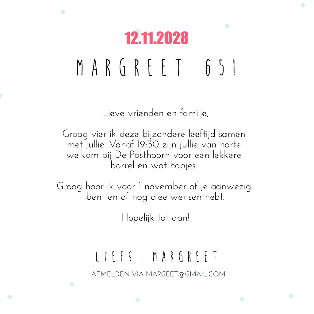 Deze feestelijke uitnodiging is uitermate geschikt voor jouw sprankelende 65e verjaardagsfeest. Extra vrolijk door de champagneglazen!