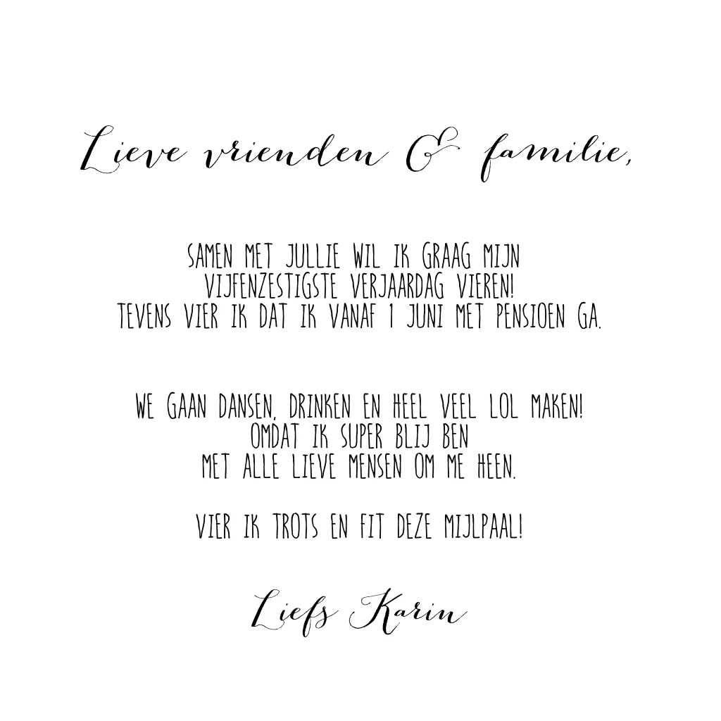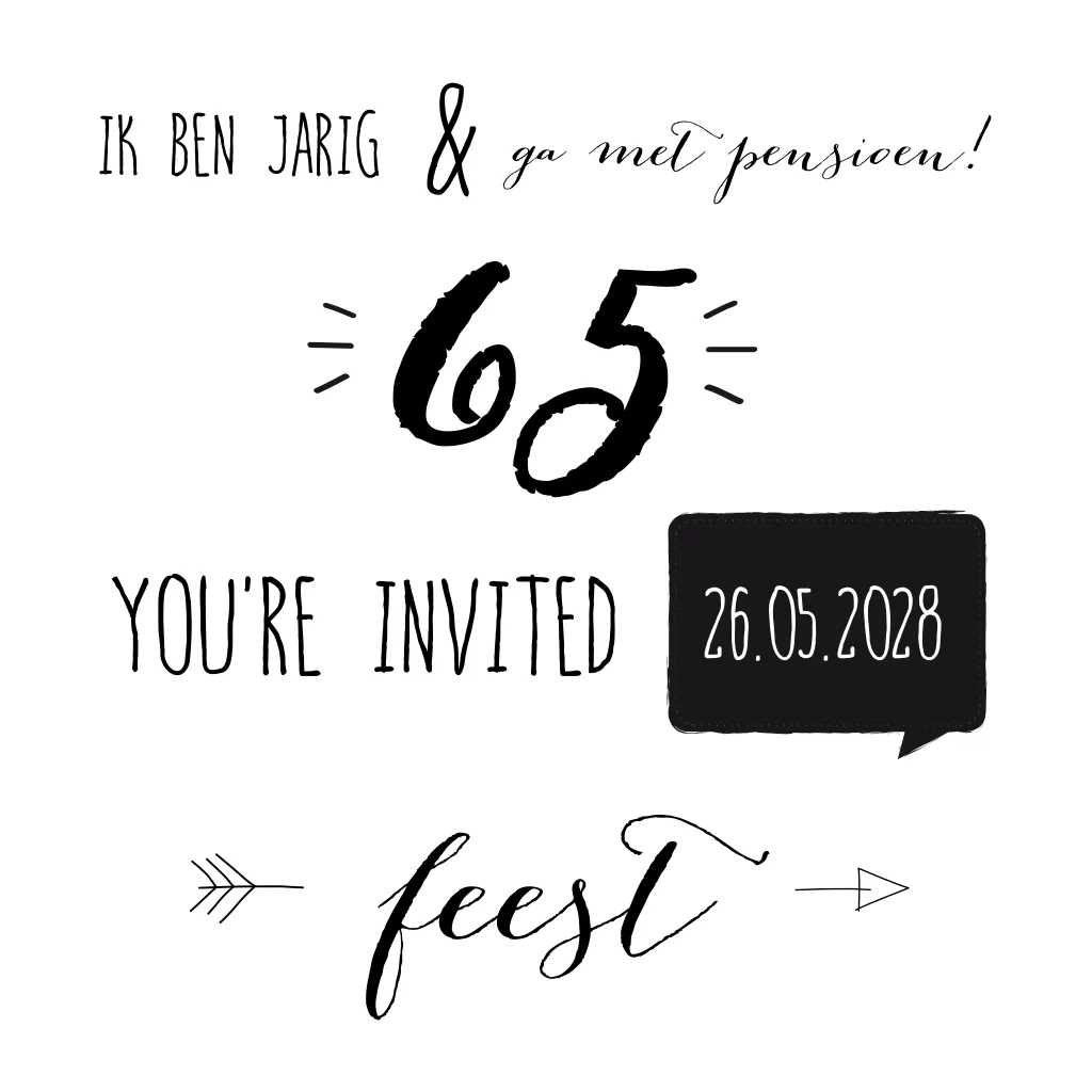 Deze bijzondere leeftijd verdient een origineel kaartje. Nodig familie en vrienden uit met deze zwart witte uitnodigingskaart voor je vijfenzestigste verjaardag of pensioenborrel. Tof om voor een zwarte envelop te kiezen en met een witte pen de adressen op te schrijven!