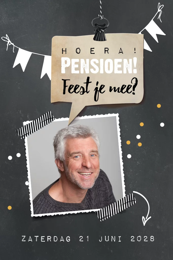 Hippe en trendy uitnodigingskaart voor een 65e verjaardag of pensioen met eigen foto, slinger en confetti op krijtbord.