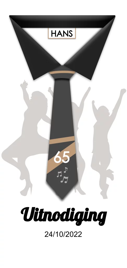 Een feestelijke kaart voor een 65e verjaardag. Leuk geïllustreerd met een stropdas. De teksten op de kaart zijn helemaal naar wens aanpasbaar. Kies voor een bijpassende kleur envelop en een feestelijke sluitzegel.