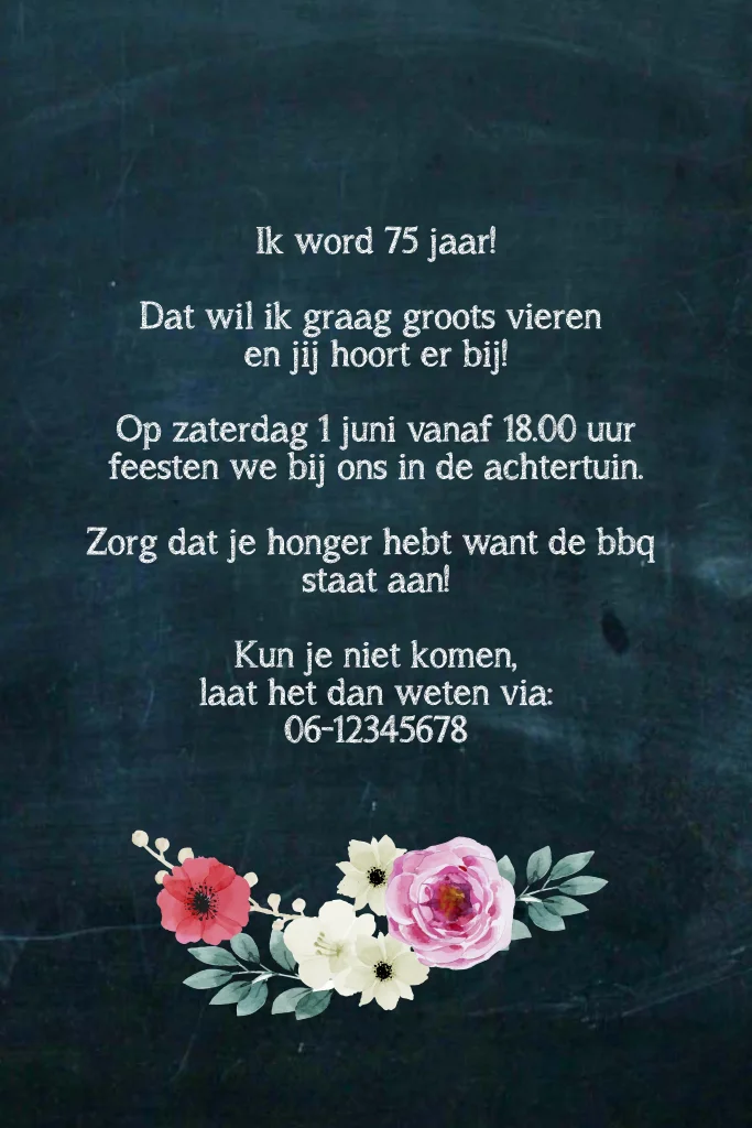 Vrolijke uitnodiging voor een verjaardag met mooie aquarel bloemen op krijtbord achtergrond. Leuk met de persoonlijke foto van de jarige.