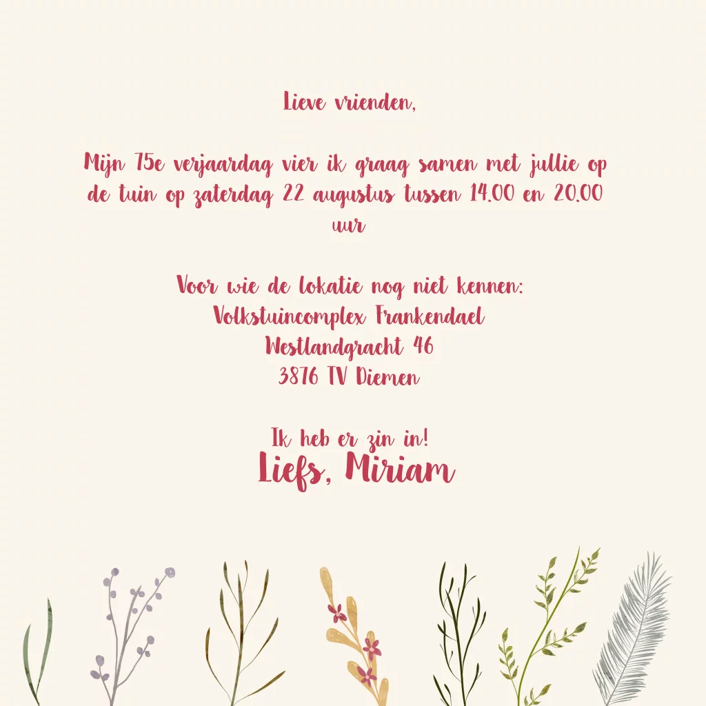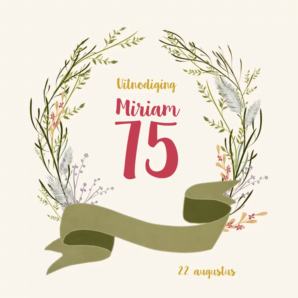 Mooie uitnodiging voor een 75e verjaardag met kruiden en bloemen krans. Aan de binnenkant ruimte voor een persoonlijke foto.