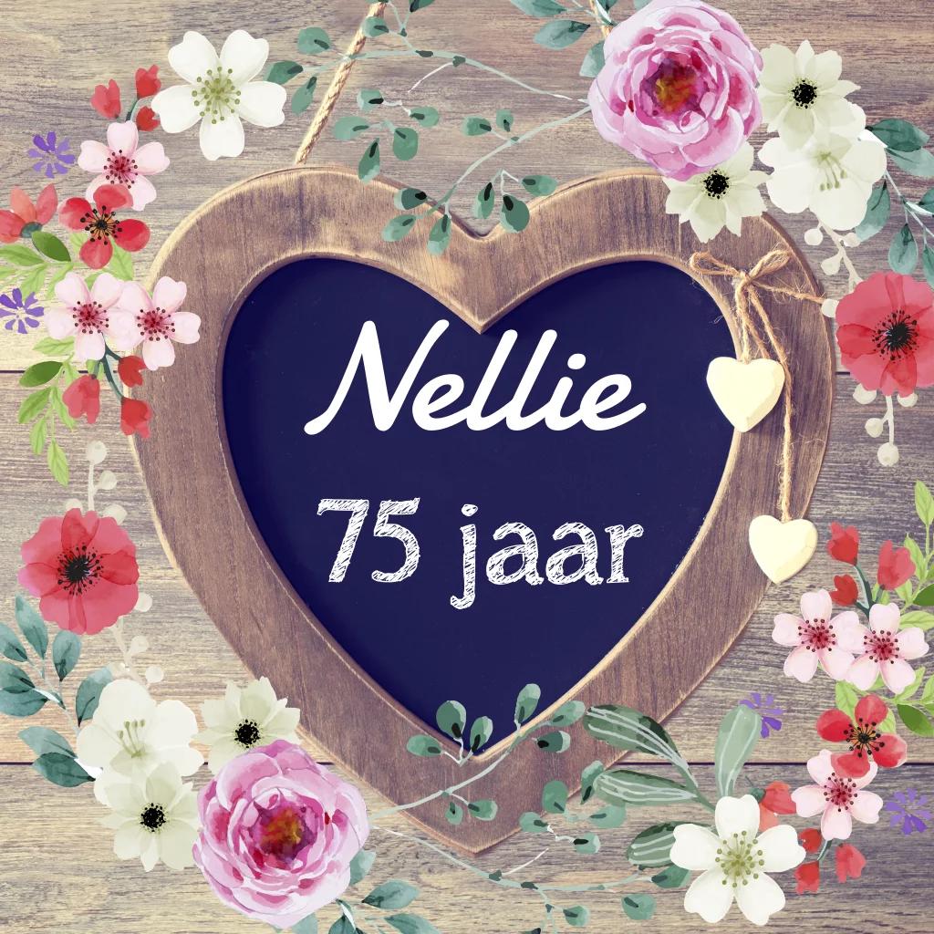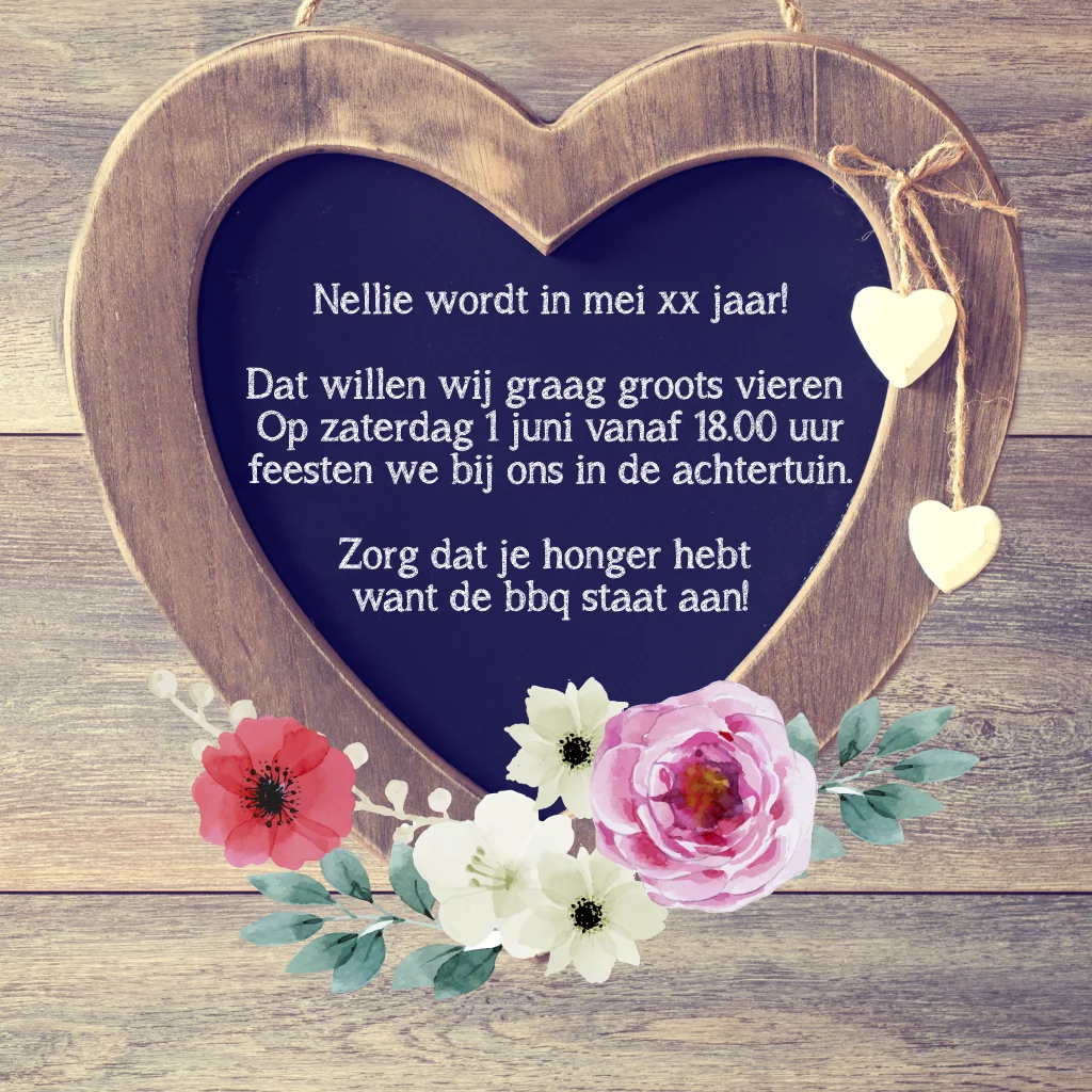 Vrolijke uitnodiging voor een 75e verjaardag op hartje van hout op krijtbord. Met mooie aquarel bloemen en vrolijke letters. Mooi met een roze envelop.