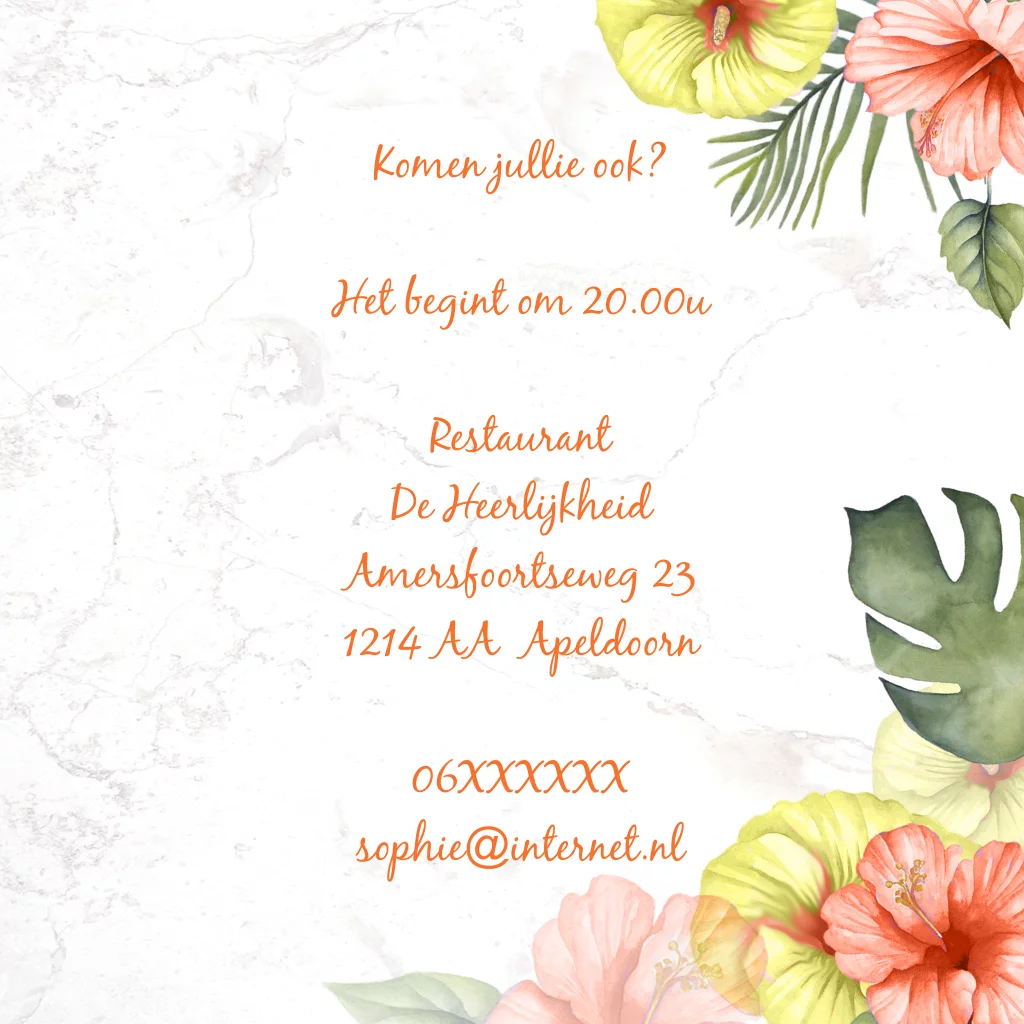 Uitnodiging voor een 75e verjaardag met mooie tropische bloemen en bladeren in aquarel stijl op marmer achtergrond. Mooi om te combineren met onze peach kleur envelop!