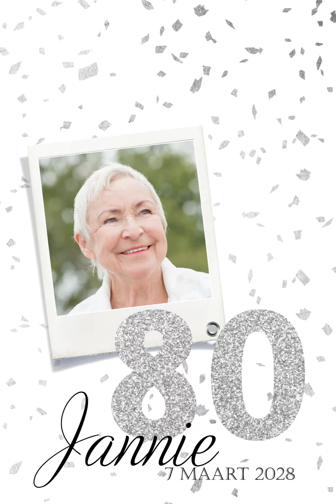Uitnodiging voor een 80e verjaardag met confetti en foto
