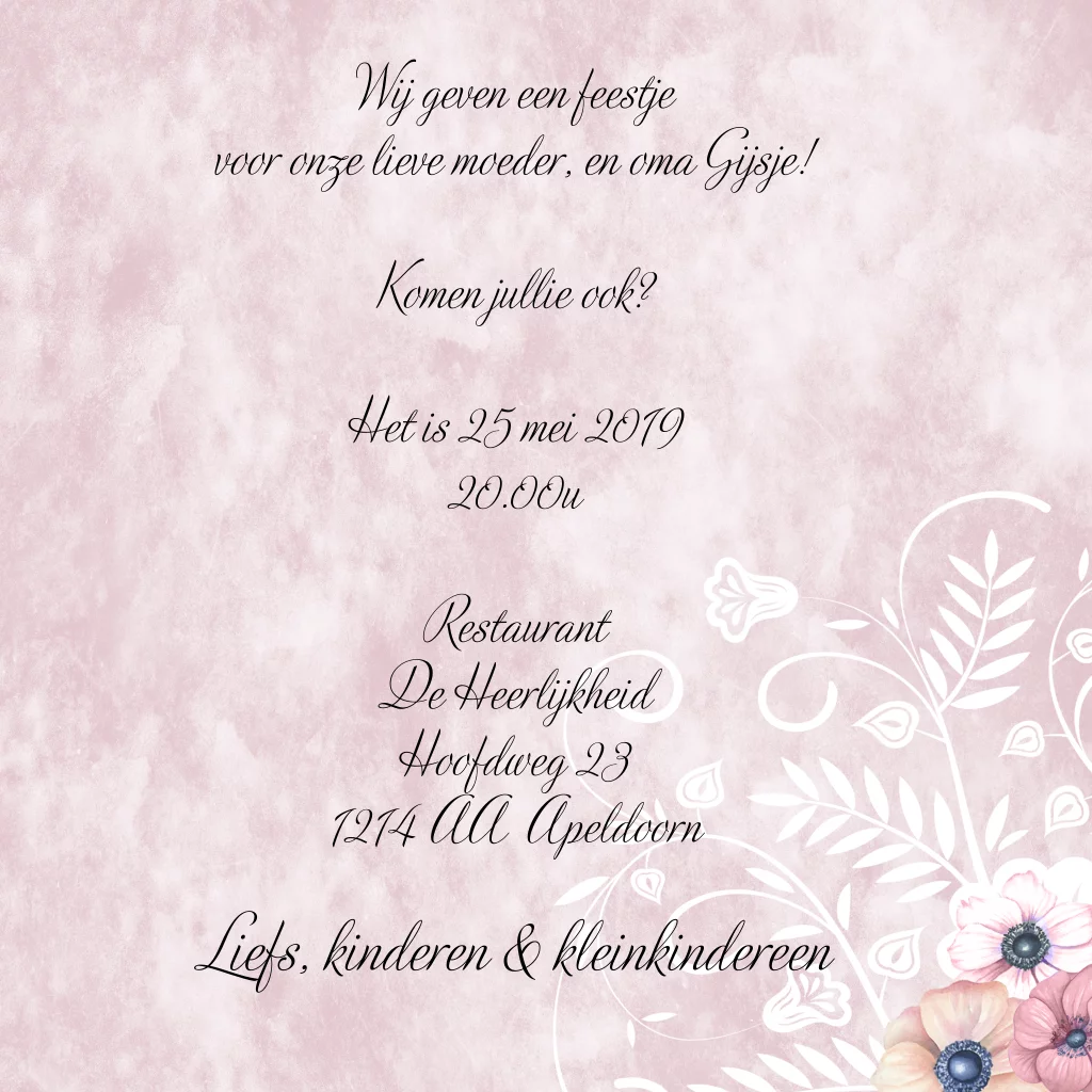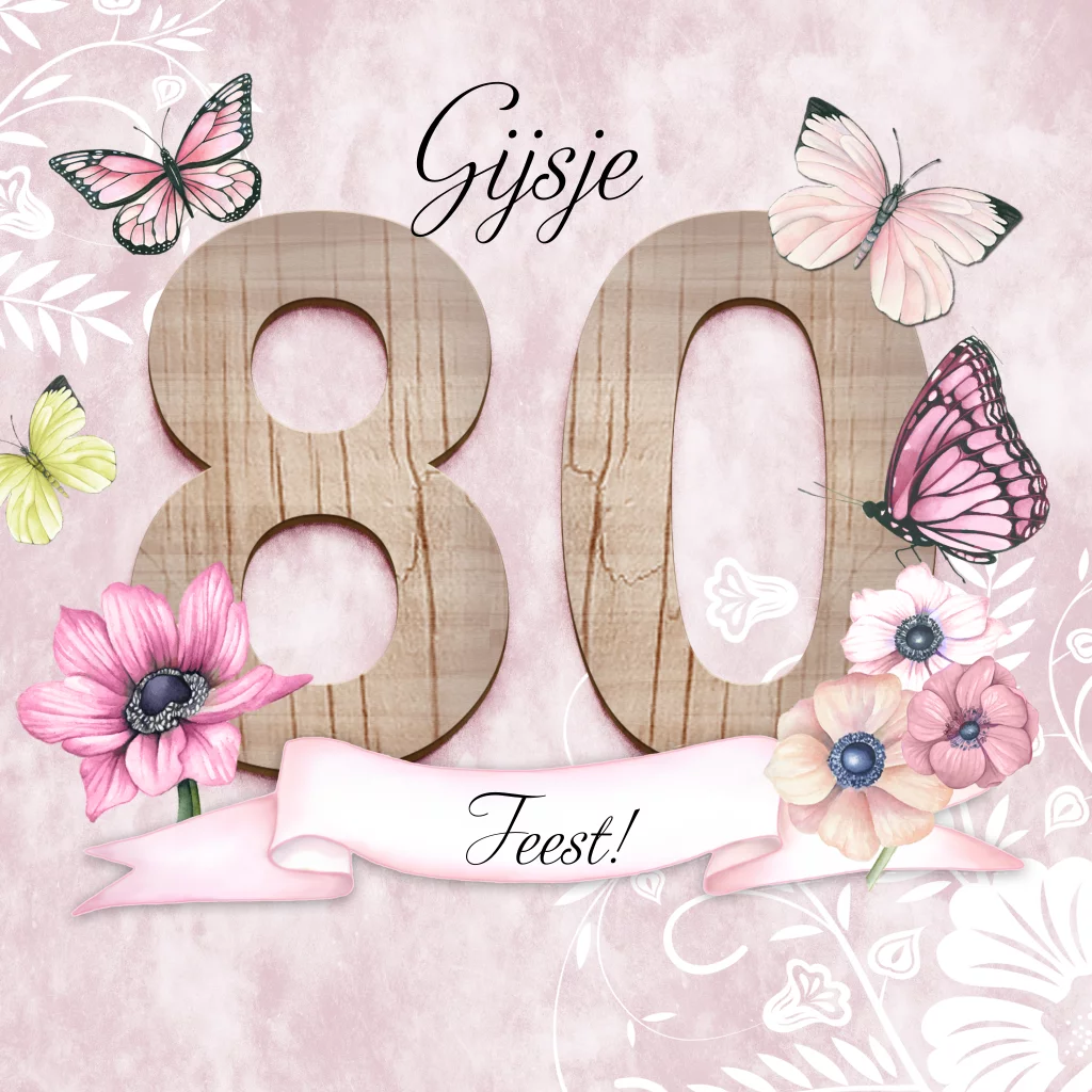 Uitnodiging voor een feestje voor tachtig jaar met houten letters versierd met mooie bloemen en vlinders