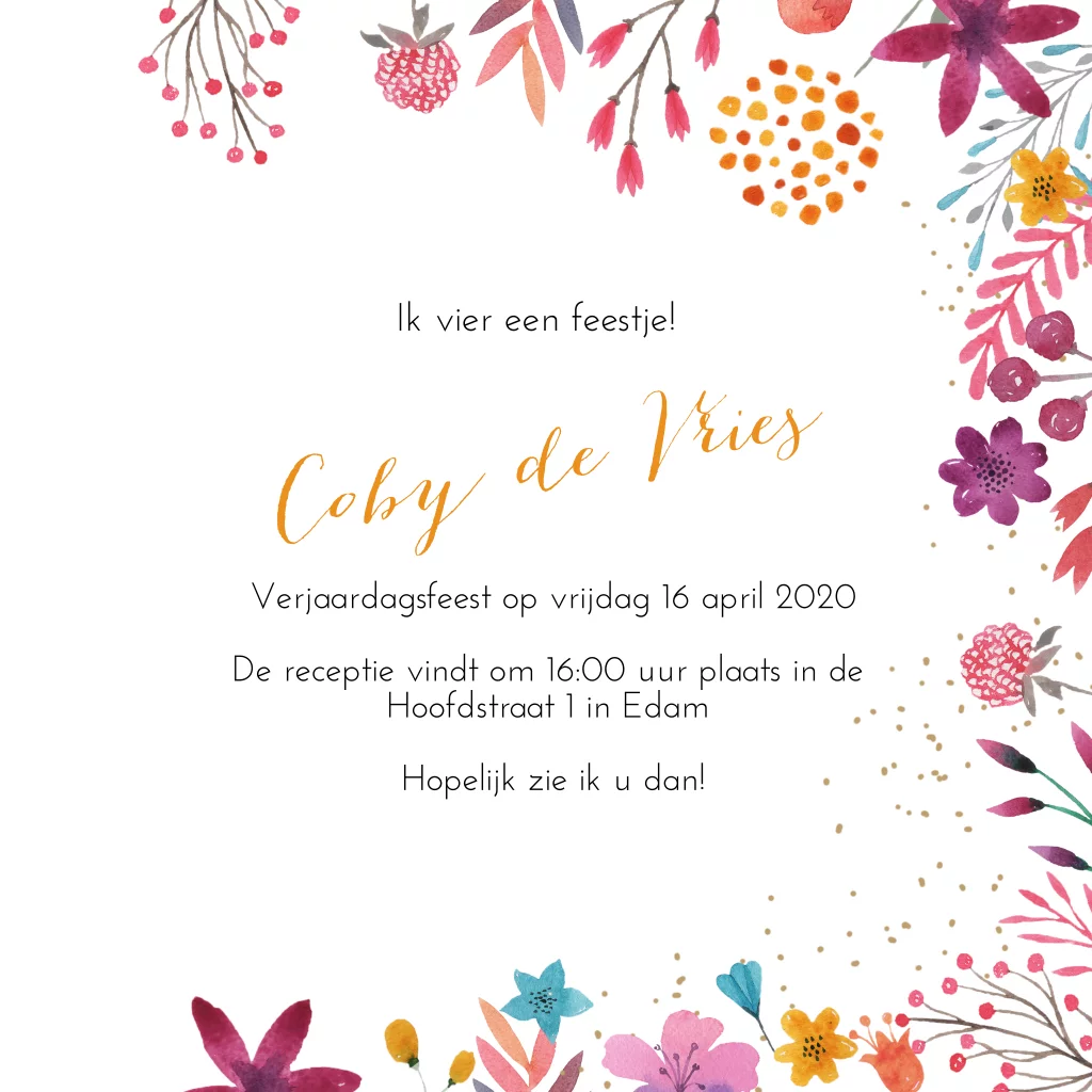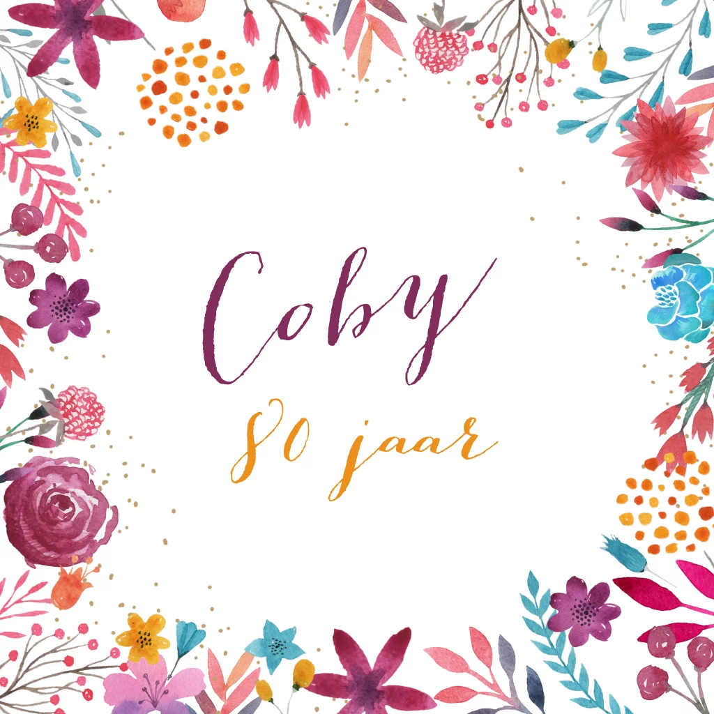 Uitnodiging voor een 80e verjaardag met kleurrijke bloemen langs de rand van de kaart. De tekst is geheel naar wens aanpasbaar. Tip! Kies een envelop die past bij een kleur uit de kaart. We wensen jouw een geweldige tachtigste verjaardag toe.