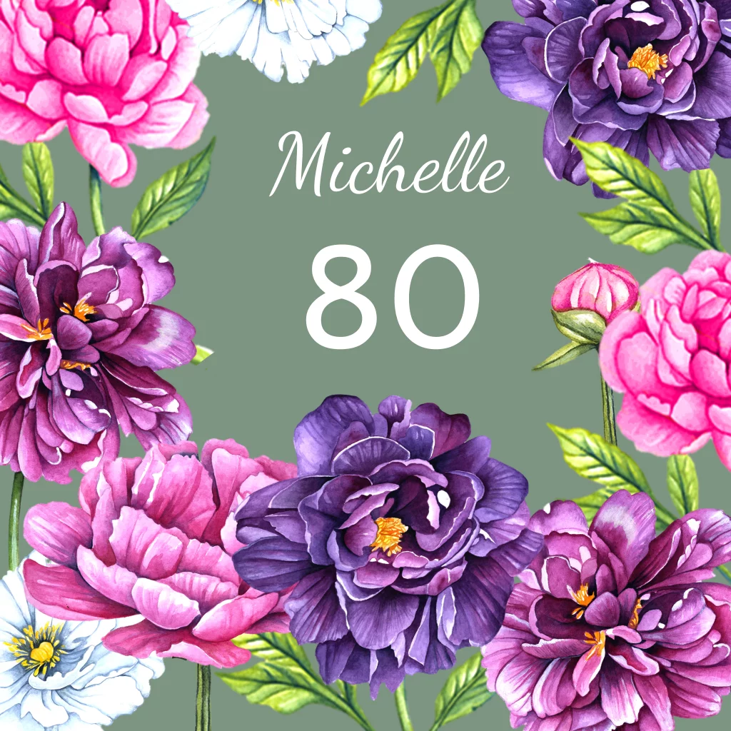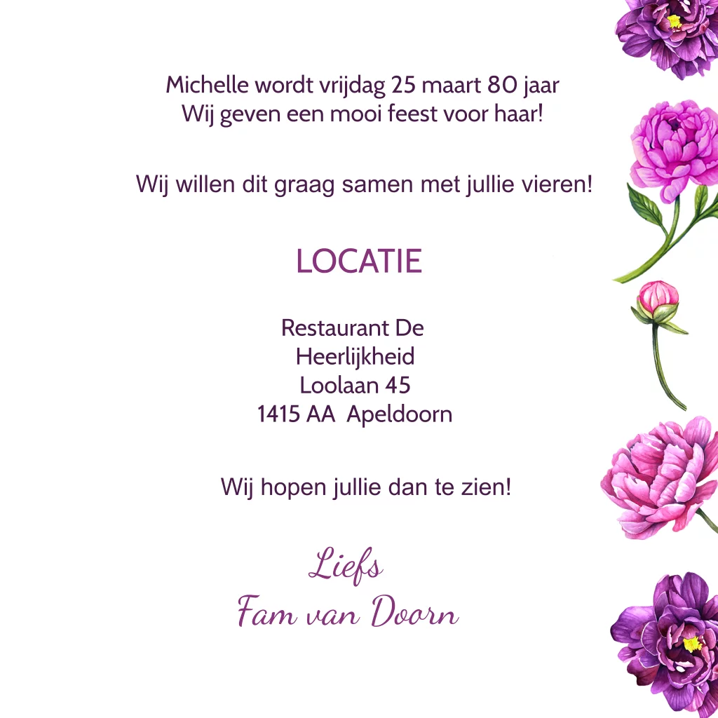 Uitnodiging voor een 80e verjaardagsfeest met mooie pioenrozen in aquarel. Pas de tekst gemakkelijk zelf aan. En kies voor een lettertype die bij jou past. Maak het af met een bijpassende kleur envelop en sluitzegel.