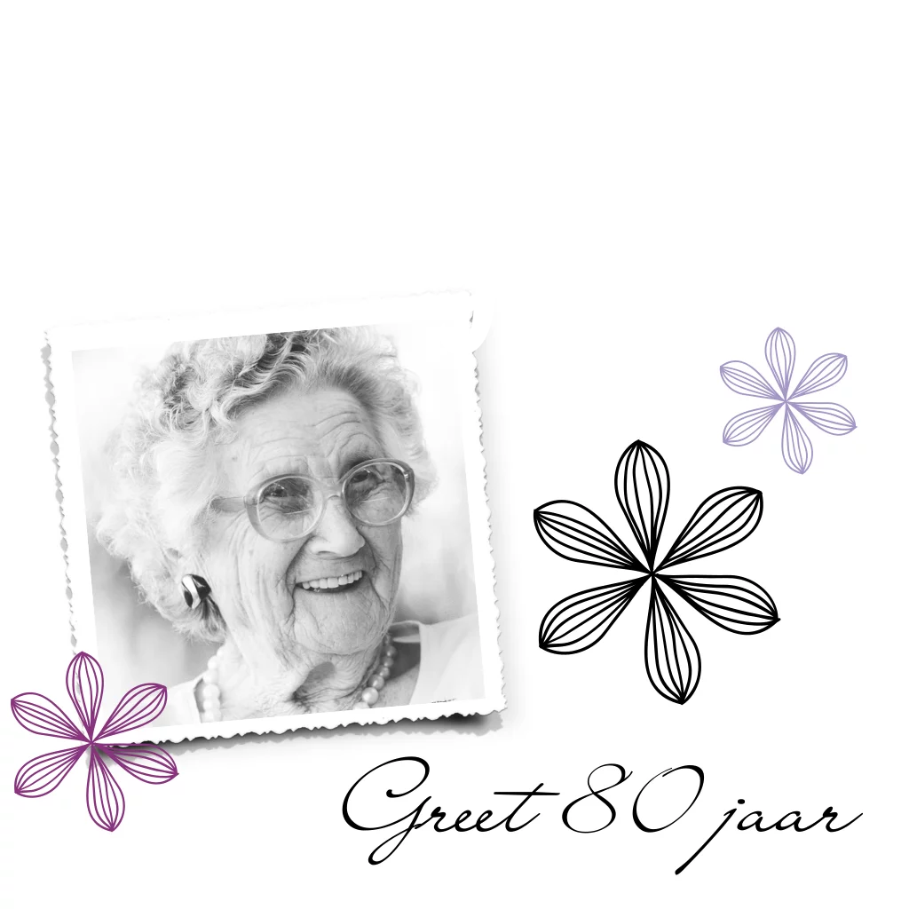 Mooie stijlvolle zwart wit uitnodiging voor een 80e verjaardag. Feestelijk door de toevoeging van een persoonlijke foto en bloemen. Kies bij deze kaart een mooie lavendel kleurige envelop!