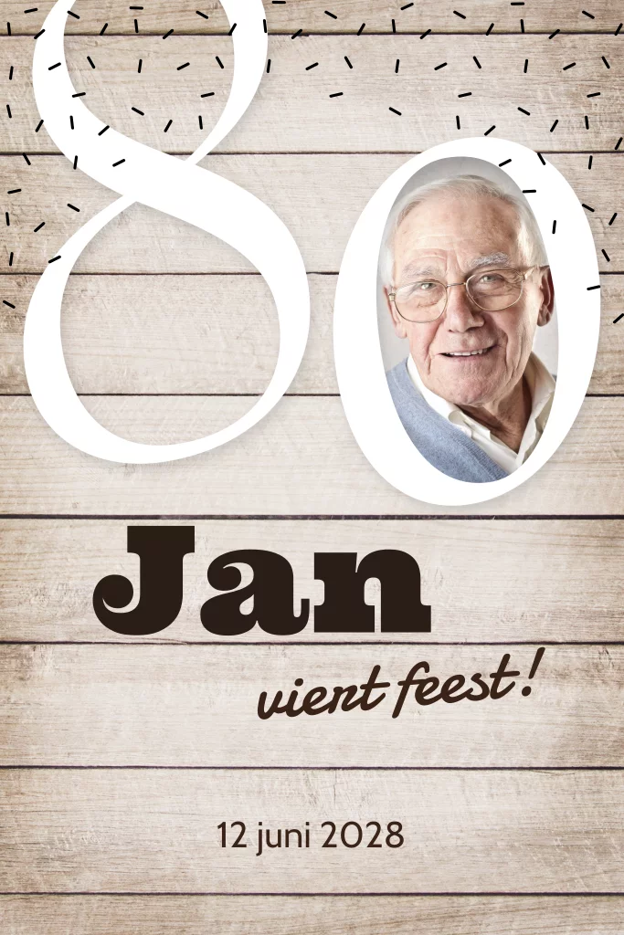 Rustige feestelijke uitnodiging 80 jaar met hout en grote 80! Persoonlijk door de foto van de jarige op de voorkant van de kaart. Deze bijzondere mijlpaal is het waard om te vieren! Mooi met een lichtgrijze envelop.