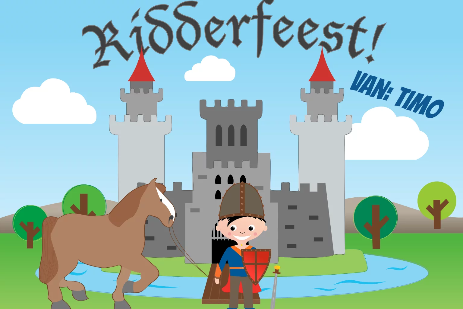 Aan deze kaart met eigen ridder, kasteel én paard is uw eigen tekst toe te voegen om alle vriendjes van uw zoon voor het kinderfeestje uit te nodigen.
