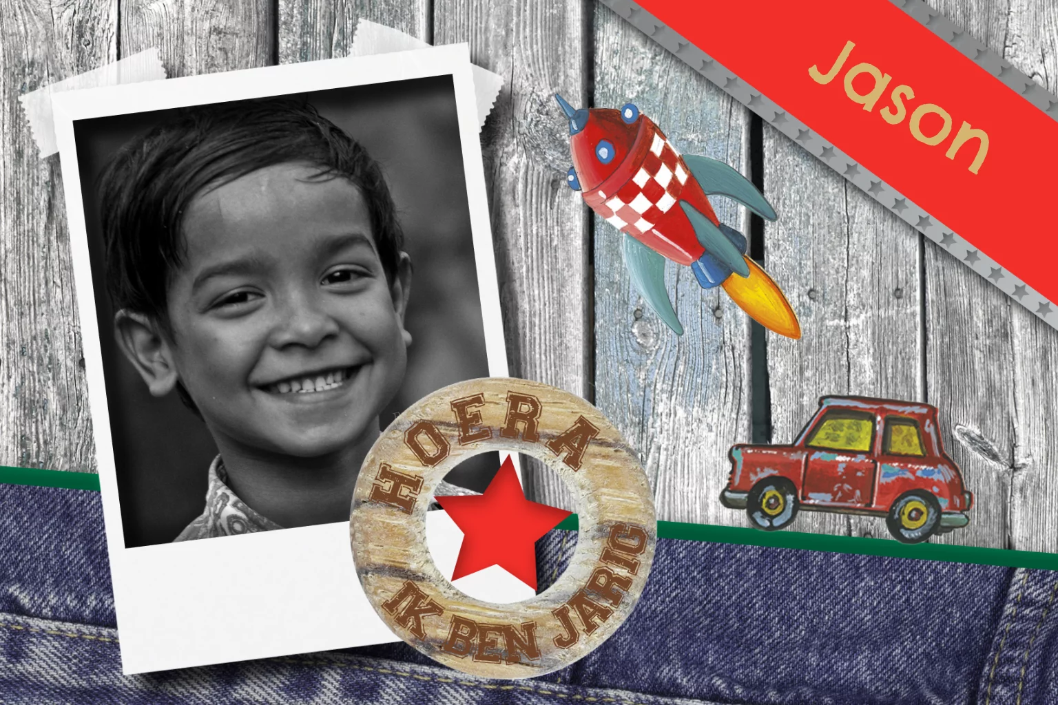 Deze kaart kunt u helemaal persoonlijk maken voor het verjaardagsfeestje van uw kind. Voeg een eigen foto toe op de houten achtergrond, spijkerstof en getekende auto.