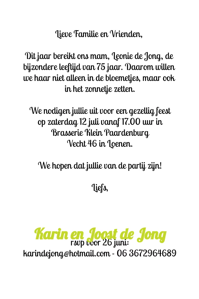 Kleurrijke en gezellige kaart voor een feest. Alle tekst is aan te passen en de kleuren van de stippen en achtergrond. Maak deze kaart in een handomdraai naar je eigen wens.