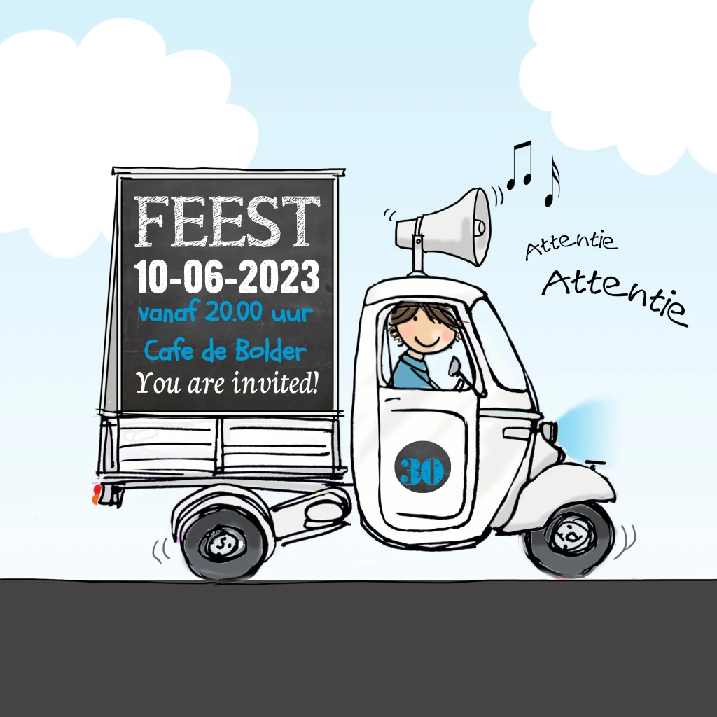Bijzonder leuke en originele uitnodigingskaart voor een jarige, tekst is geheel aanpasbaar.
