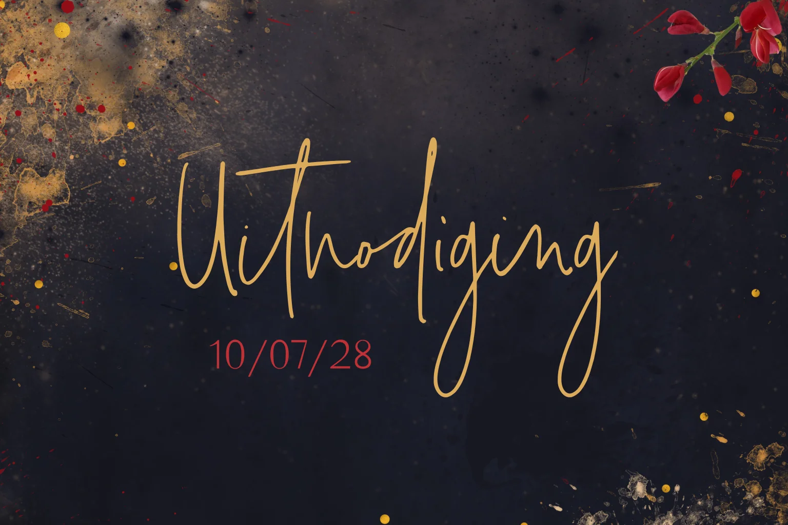 Een feestelijke kaart met bloemen op een met gouden en rode verfspetters beklede achtergrond.