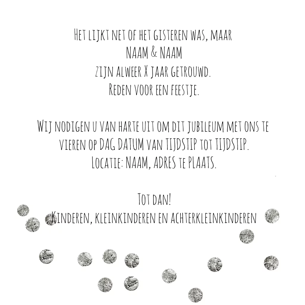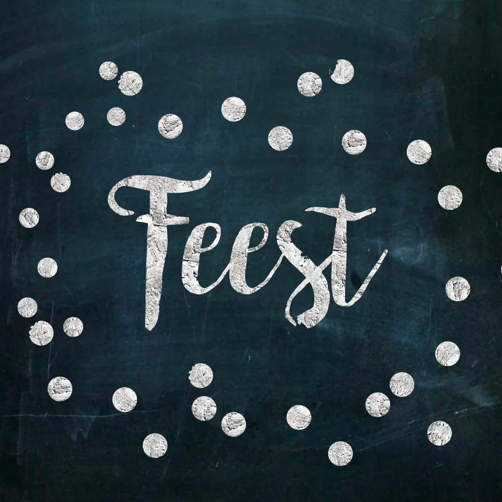 Krijtbord uitnodigingskaart met zilveren bolletjes voor jouw feest.