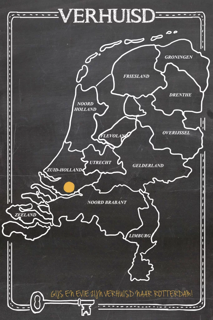 Stoere uitnodiging voor een housewarming. Verplaats de de rode stip op de kaart naar je nieuwe woonplaats en nodig je gasten uit.