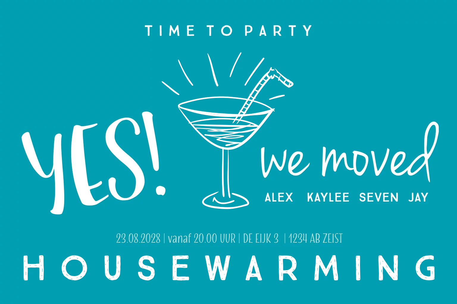 Hoe leuk zijn al die verschillende lettertypes op de kaart? Stuur deze uitnodiging met cocktailglas naar vrienden en familie voor een gezellige housewarming! Leuk met een mintgroene envelop.
