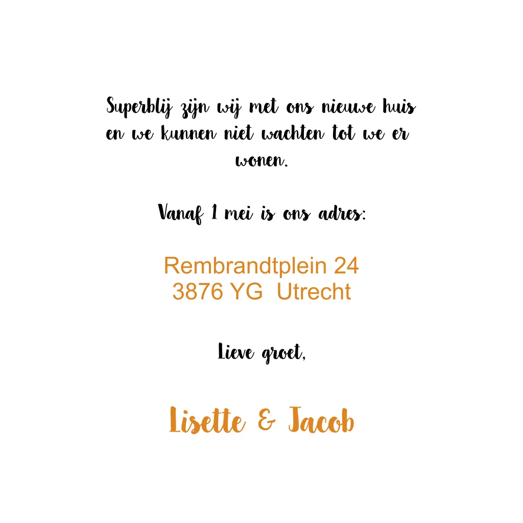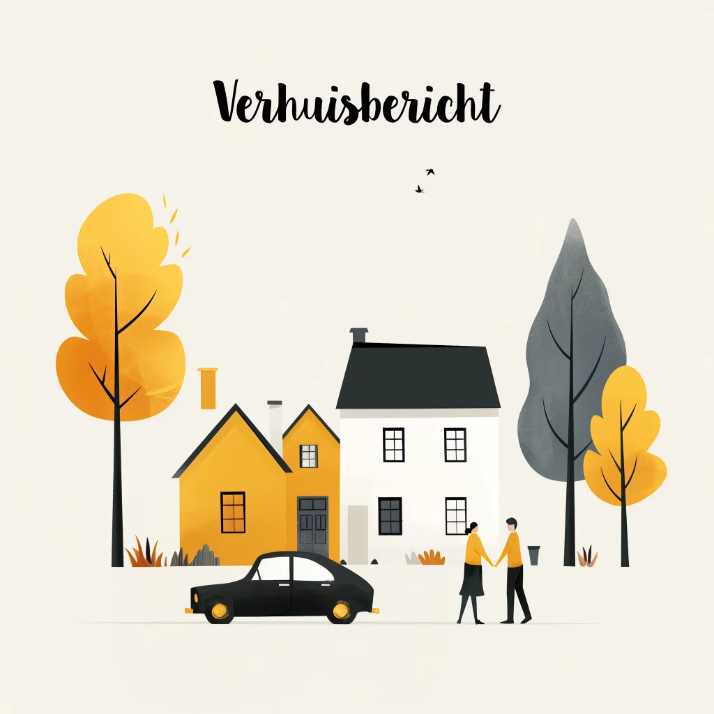 Vrolijke verhuiskaart met huisjes, boompjes en auto. In oker, grijs, wit en zwart tinten.
