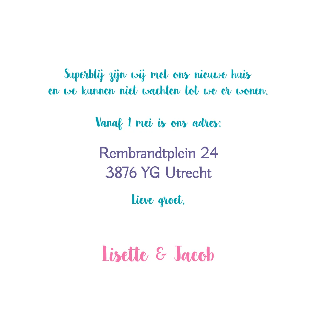Creatieve verhuiskaart met flinke klodders verf in diverse pasteltinten. Superleuke adreswijziging.