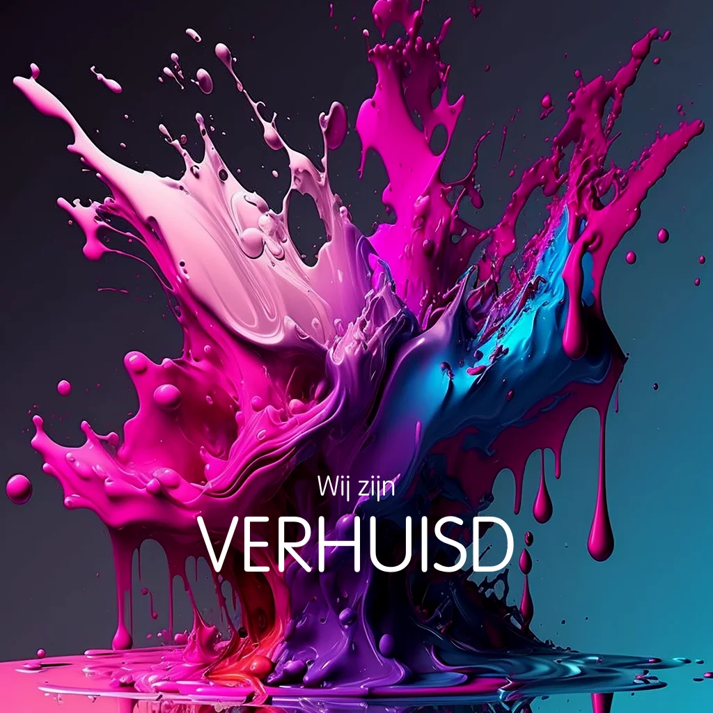 Prachtige en lekker expressieve verhuiskaart met een vrolijke verfexplosie. Mooi opvallende adreswijziging.