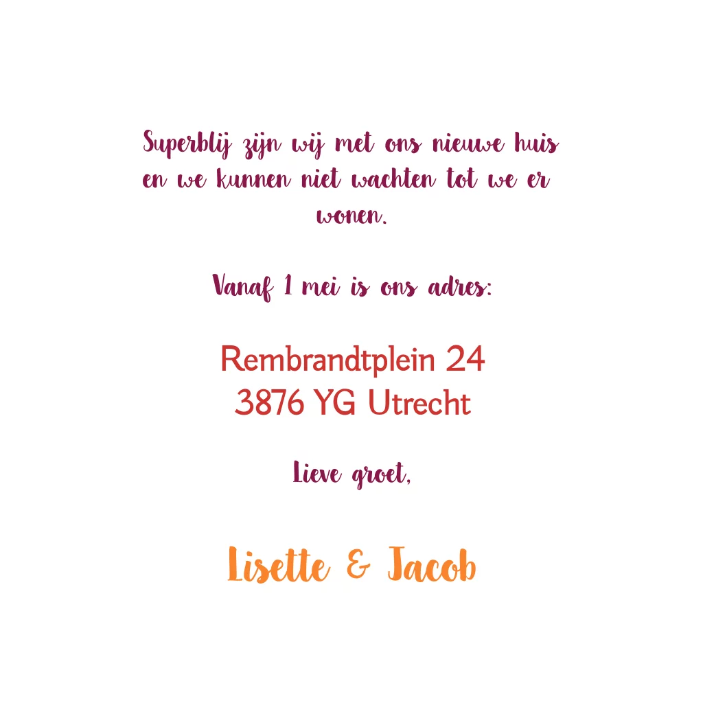 Vrolijke adreswijziging waar de verf vanaf spat. Lekkere verfstrepen in roze, rood en oranje tinten. Een heus kunstwerk.