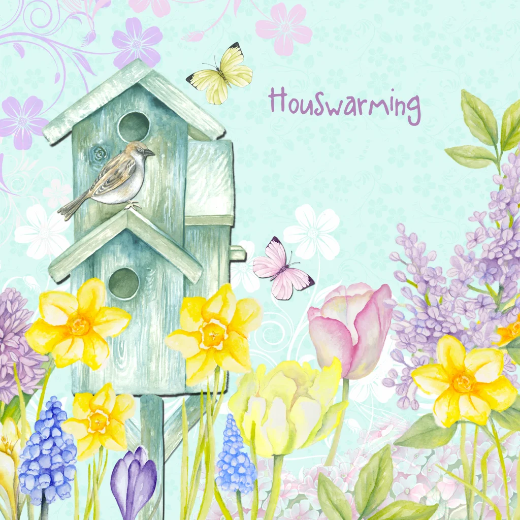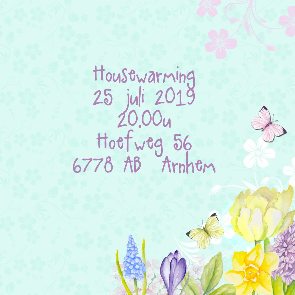 Een vogelhuisje op je verhuiskaart is helemaal in. Het bloemenpatroon op de achtergrond en de pastelkleuren laten het geheel er lief uitzien.