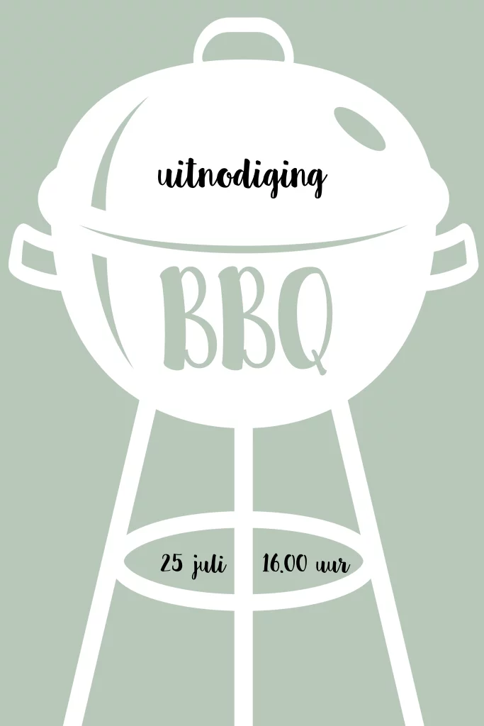 Strakke verjaardagsuitnodiging voor een tuinfeestje met barbeque. De groene achtergrondkleur kun je naar wens aanpassen..Leuk met een bijpassende kleur envelop en sluitzegel.