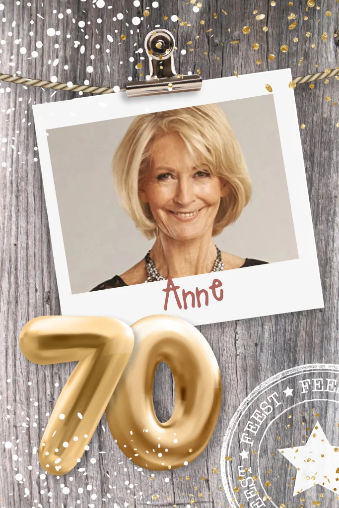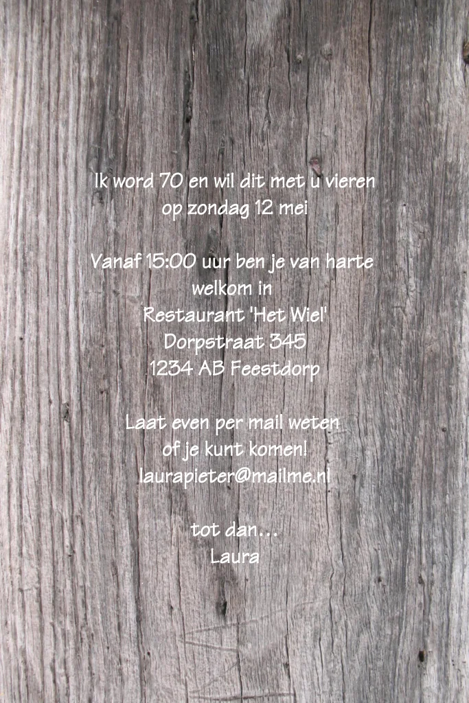 Stijlvolle verjaardagsuitnodiging met goud en hout. Pas de fotokaart aan in onze online editor.