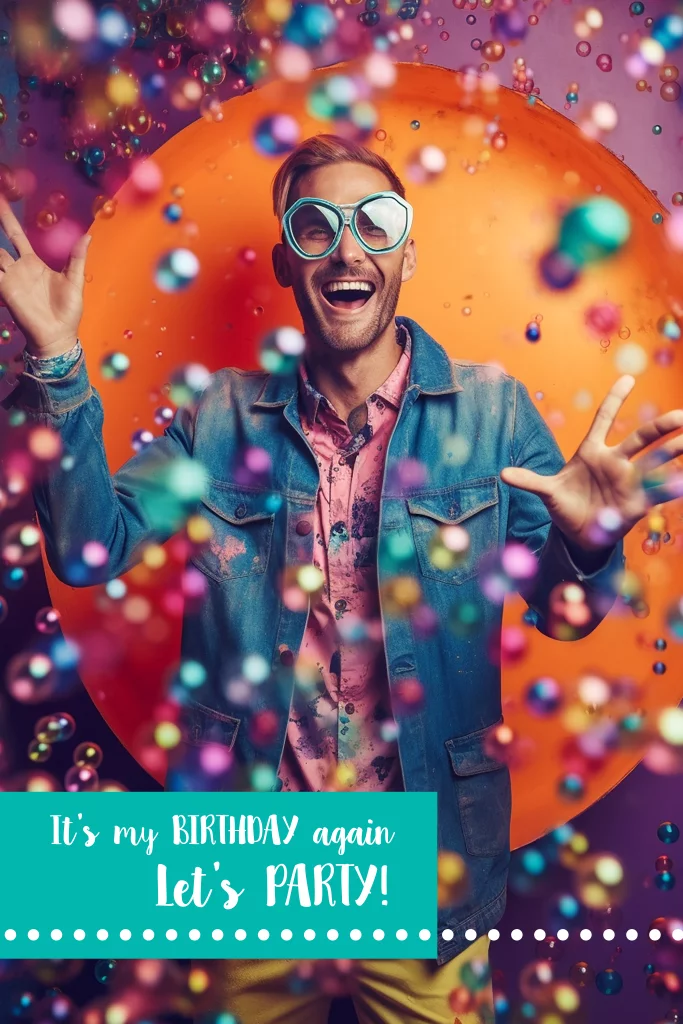Uitnodiging met een vrolijk model tussen de bellenblaas. Superhip omdat hij door AI in het leven is geroepen. Een uniek portret. Je kunt het portret natuurlijk ook vervangen door een leuke foto van jezelf.