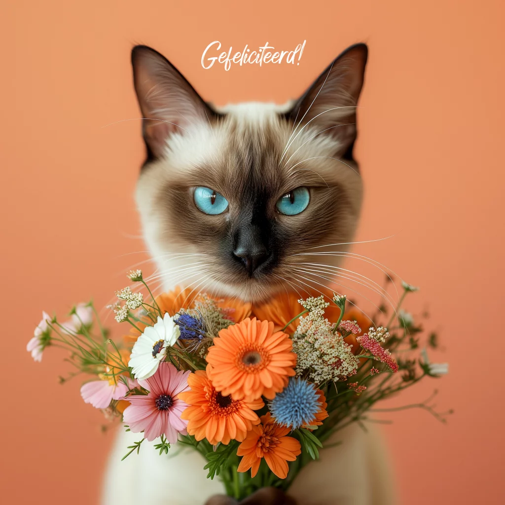 Een super schattige felicitatiekaart. Van een prachtige Siamese kat met een bosje bloemen. Smelt .... ;-)